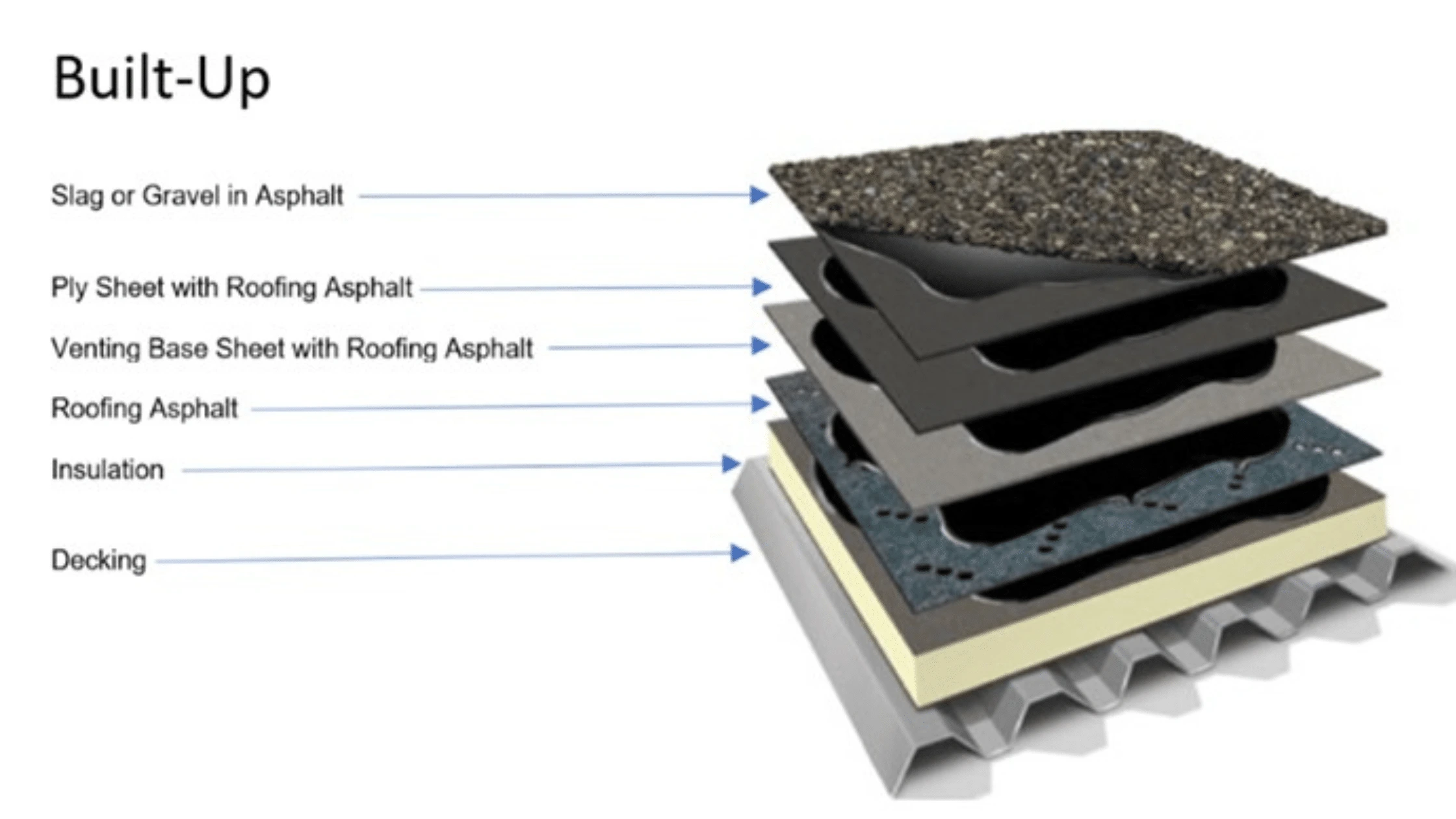 Built‑Up Roofing (BUR) systems use multiple layers of asphalt and reinforcing fabrics to create a thick, watertight roofing assembly. Known for their durability, fire resistance, and excellent insulation properties, BUR systems have protected commercial buildings for decades. They are well‑suited for large facilities requiring long‑term performance and minimal maintenance.